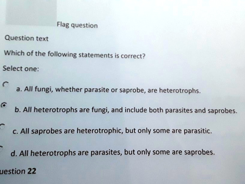 Solved Flag Question Question Text Which Of The Following Statements Is Correct Select One A All Fungi Whether Parasite Or Saprobe Are Heterotrophs B All Heterotrophs Are Fungi And Include Both Parasites And Saprobes
